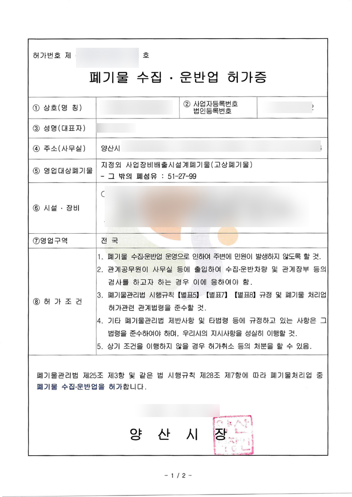 폐합성수지, 폐가전 등 입찰을 위해 폐기물 수집운반업 허가가 필요한 분들이 계십니다.