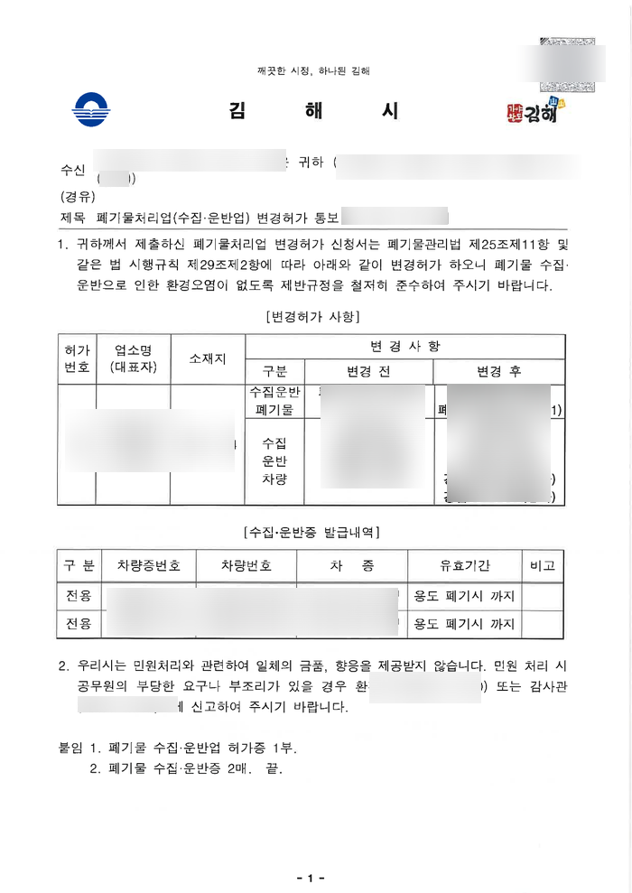 얼마 전에 김해에 계신 고객에게 의뢰를 받아, 폐기물 수집, 운반업의 변경 허가 업무를 진행했습니다.