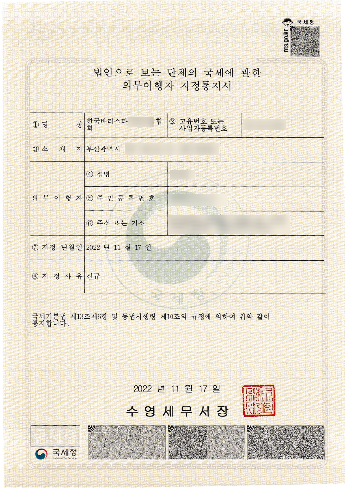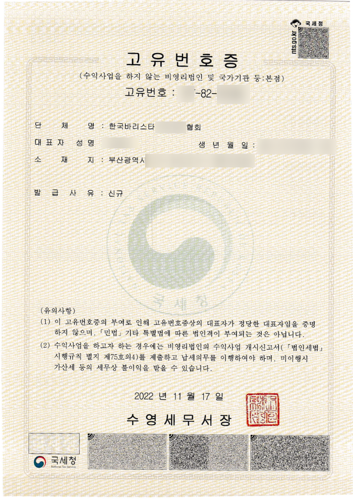 안녕하세요 오늘은 바리스타 협회 등록이 완료 되어, 그 내용을 소개해 드리려고 합니다. 일반적으로 협회 등록은 임의단체 등록, 법인으로 보는 단체 등록 등 여러 명칭으로 불리는데, 대부분은 민간자격증 등록, 운영을 하기 위한 초석입니다. 물론, 협회 등록 후 고유번호증 자체를 목적으로 하는 분들도 있습니다. 이 경우, 단체의 재산을 투명하게 관리하기 위한 목적이거나, 비법인 사단의 통장을 만들기 위한 목적이라고 보시면 됩니다.