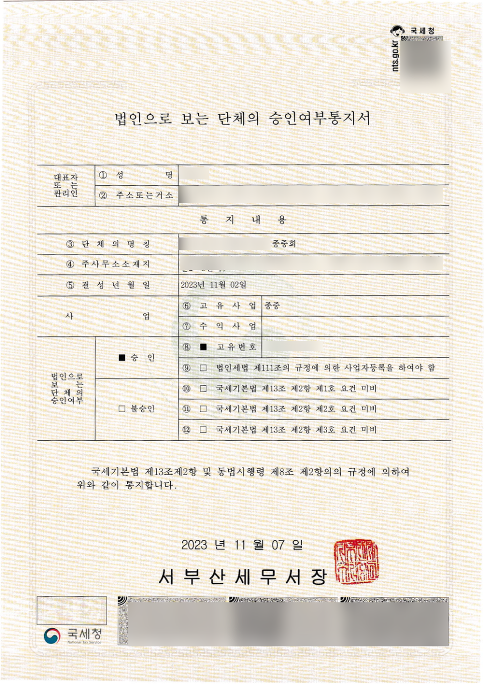 사단법인, 재단법인을 붙이려면 허가증이 반드시 있어야 하며, 이 경우 고유번호증 발급이 아니라 법인 설립 신고를 하게 됩니다.