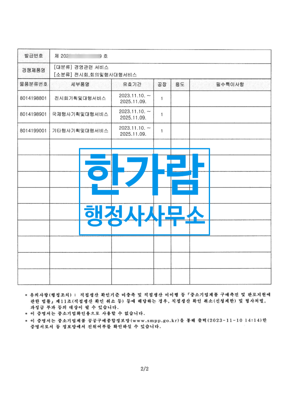 국제회의 (국제행사기획및대행서비스) 직접생산확인증명서 발급 시 유의사항