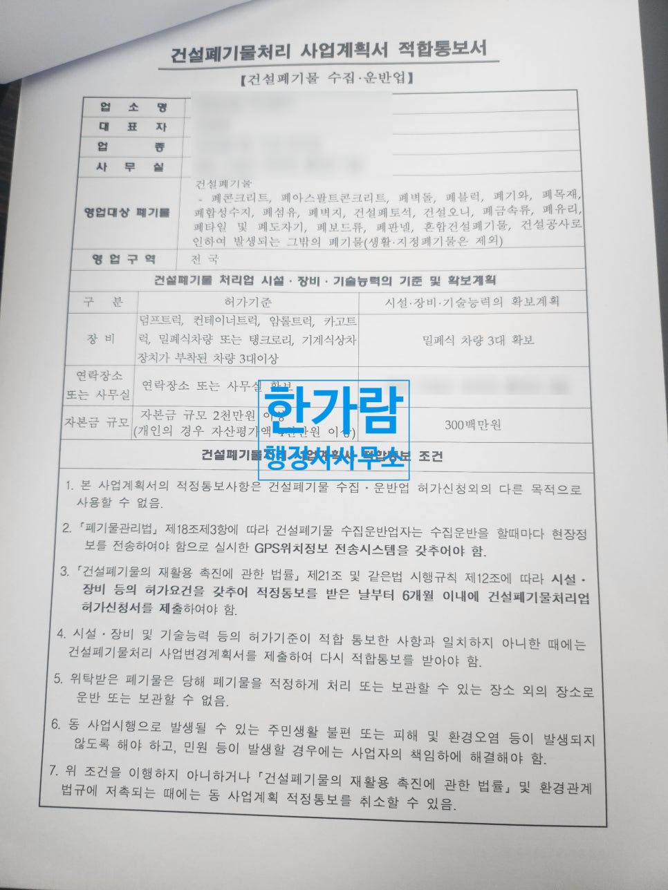 건설폐기물처리업 수집. 운반업 허가신청 조건