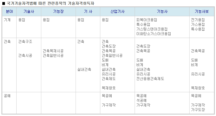 기계, 건축, 공예분야의 기술사, 기능장, 기사, 산업기사, 기능사, 기능사, 기능사보의 경우 관련 기술자격 취득자로 인정이 됩니다.