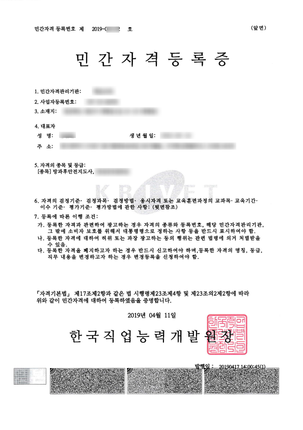 자격 등록이 완료되면 직업능력개발원에서 회신이 오며, 등록면허세를 내고 민간자격 등록증을 발급 받아 운영할 수 있습니다. 민간자격 등록에 관한 업무 대행이 필요하실 경우 연락주시기 바랍니다. 감사합니다.