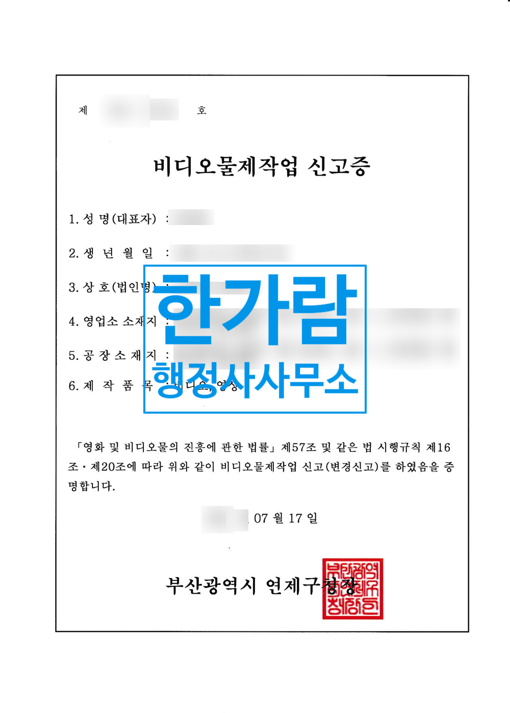 비디오물제작업 신고부터 동영상직접생산확인증명서 발급 전문대행 행정사