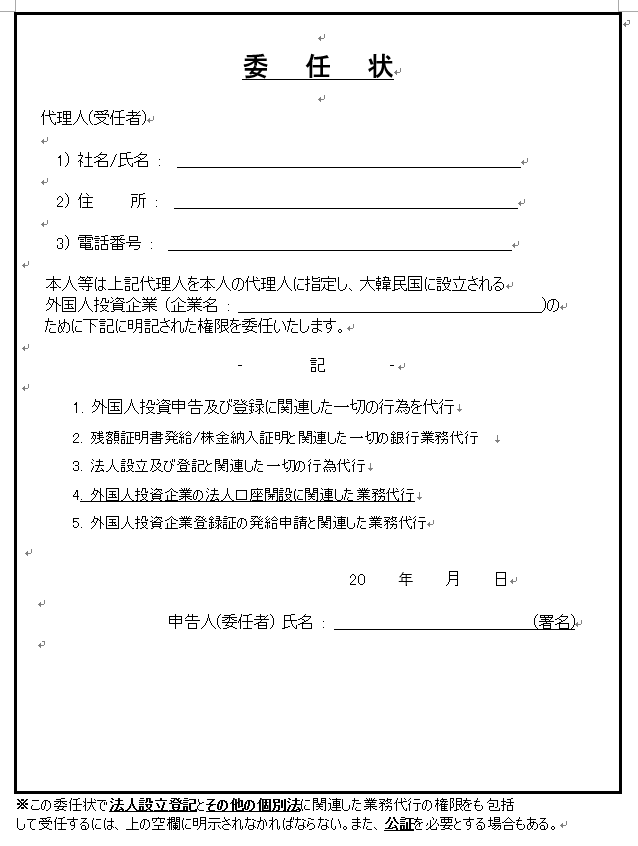 가장 먼저 진행되는 절차는 외국환 은행에 투자신고를 하는 일입니다. 통상 한국을 방문하여 진행하는데, 한국 방문이 어려울 경우에는 외국에서 위임장을 공증 및 아포스티유 해서 들고와야 합니다.