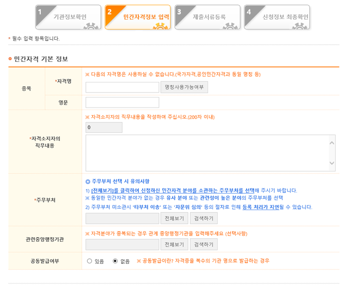 민간자격증의 명칭, 직무, 주무부처, 급수에 따른 세부 사항, 응시자 본인 확인 방법 등을 입력하고,