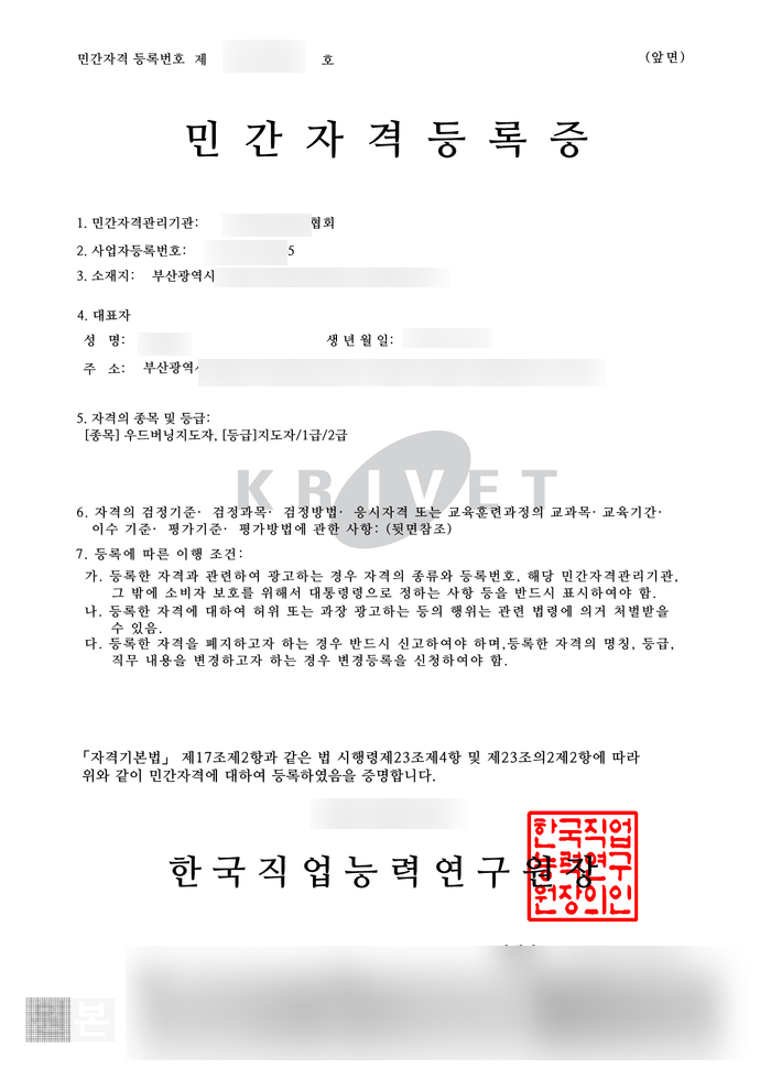 ⑨ 민간자격의 명칭, 급수, 대표자 신분증 1부