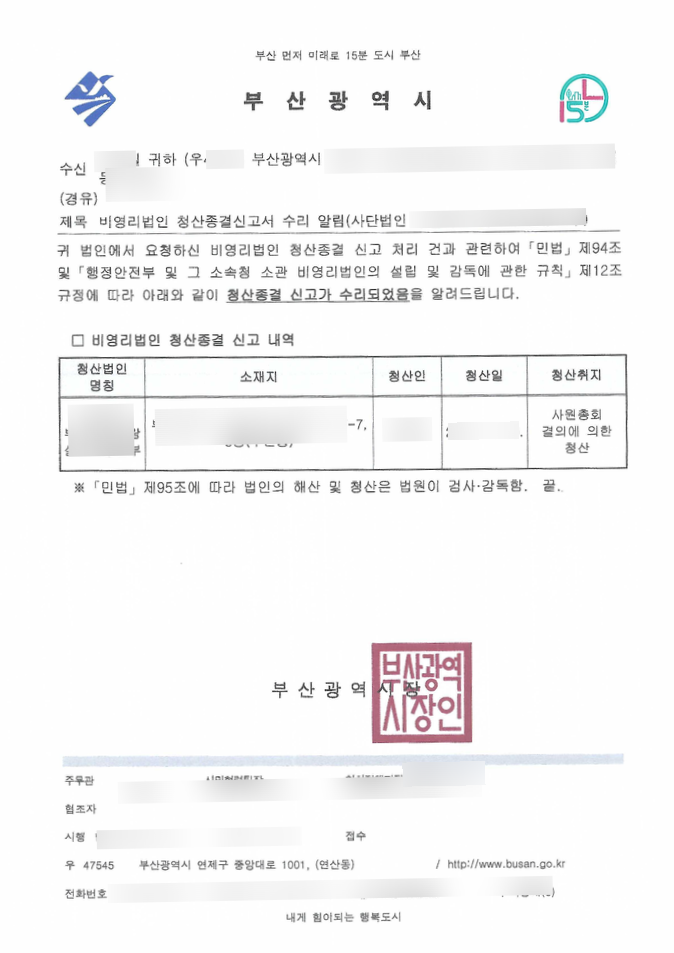 이사회, 총회, 해산등기, 청산인 선임 등기, 주무관청 해산 신고, 청산 등기, 재산처분 신고 등등, 관련하여 궁금한 사항이 있는 경우 언제든 연락주시기 바랍니다.