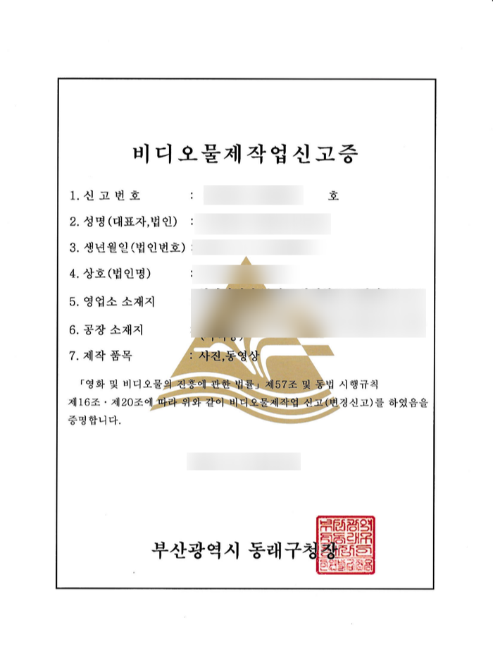 비디오물제작업 신고는 크게 어려운 신고는 아니며, 사업자등록증과 임대차계약서 그리고 장비에 대한 내역서만 있으면 발급이 됩니다.