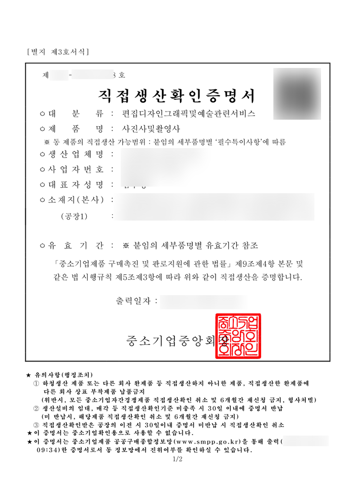 시청, 구청 등에서 발급하며, 발급 이후에 직접생산확인 증명서 신청을 할 수 있습니다.