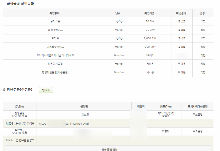 안전확인대상생활화학제품 확인 결과서 안에 두번째 페이지인 화학물질 확인결과 를 보고 입력하면 됩니다.
