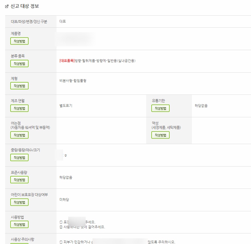 품목에 맞는 제형을 입력해주시고 사용방법, 주의사항, 응급처치 방법에 대해 자세히 기입합니다.