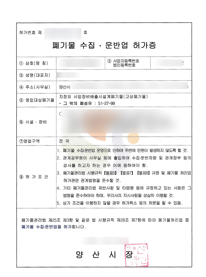 일반적으로 차량이 있어도 2개월 정도 기간이 소요되기 때문에, 입찰을 보려면 미리 폐기물수집운반 허가를 받아야 합니다.