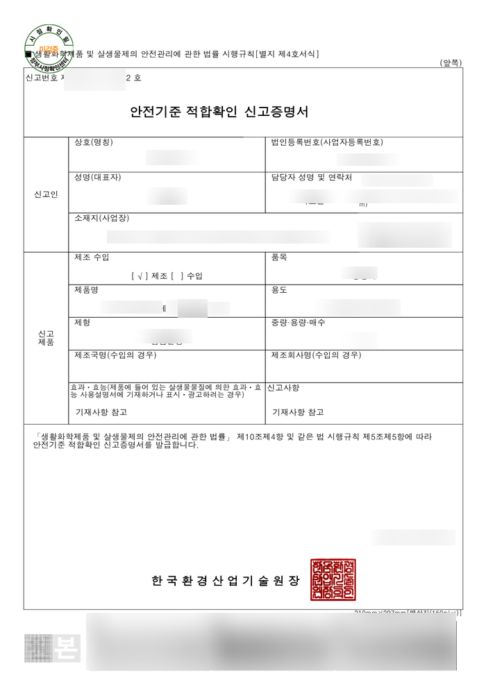 이를 위해서는 시험 신청 서류를 작성해야 하는데, 살균제를 만드는데 사용된 모든 재료의 MSDS가 필요합니다.