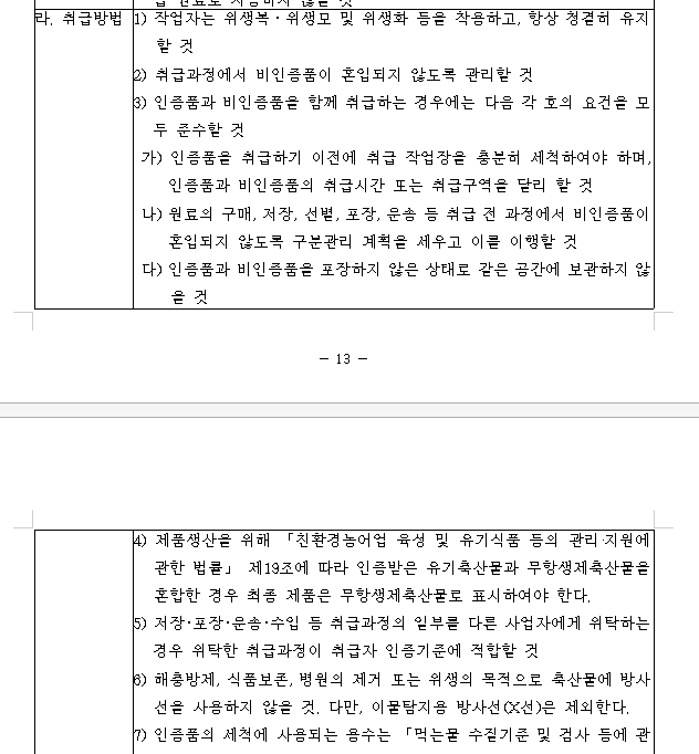 취급방법은 기본적으로 HACCP의 기준으로 관리를 하되, 무항생제 인증에서 가장 중요한 항목으로는 제품이 들어오고 나가는 인수, 취급, 출고의 모든 과정에서 인증품과 비인증품이 혼입되지 않도록 관리되는 것이 핵심입니다.