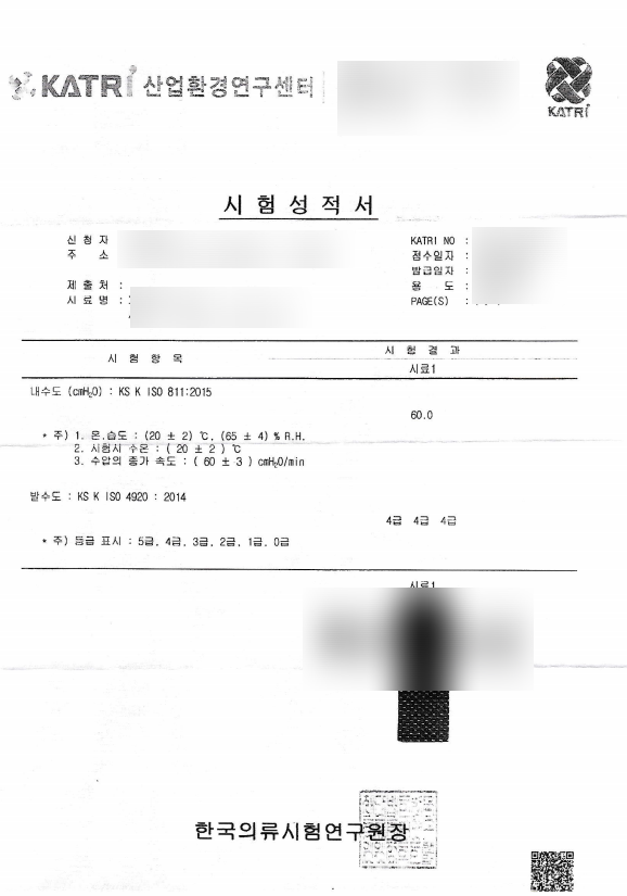 발수도 즉 방수 관련 재질 시험성적서입니다.
