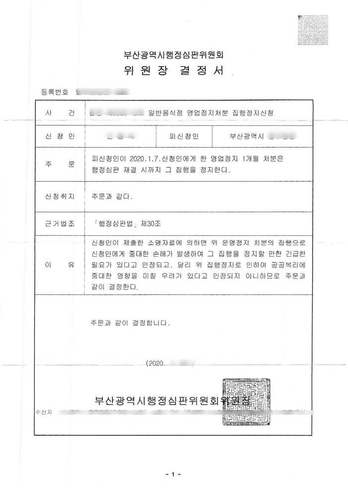 집행정지가 결정되면 아래와 같이 결정서가 나옵니다.