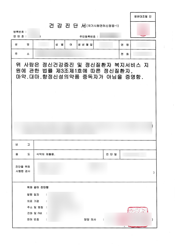 정신질환, 마약류 중독자는 업을 할 수 없으며, 병원에서 진단을 받은 내용 제출