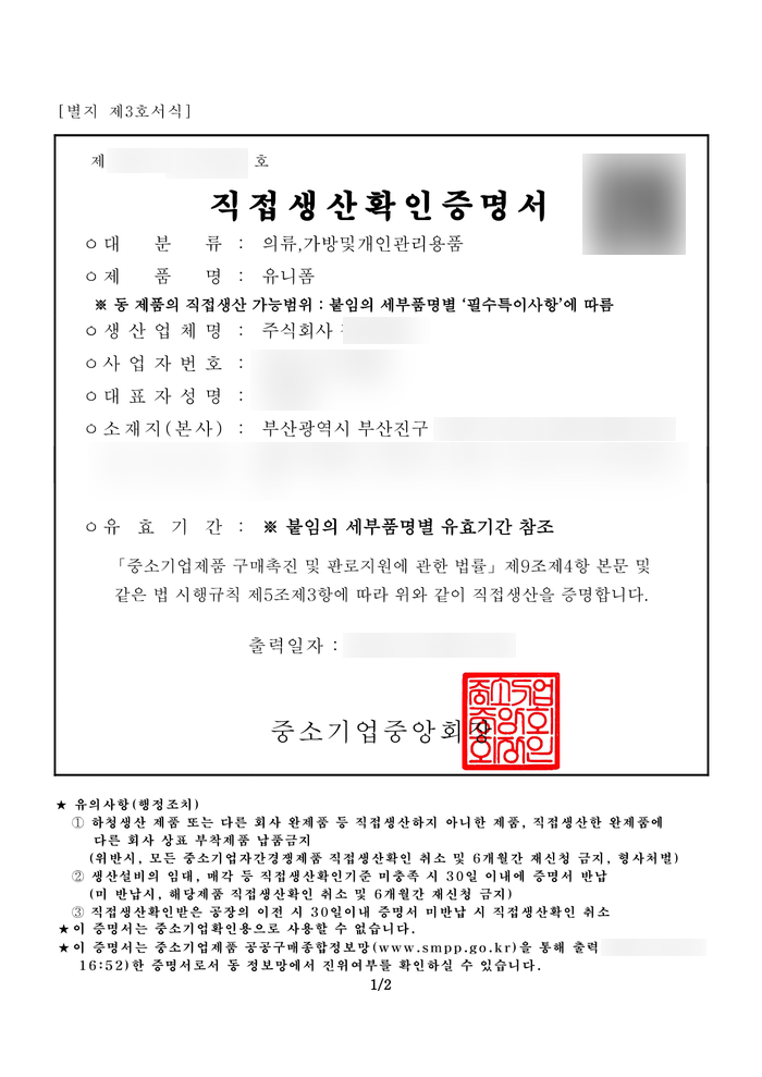운동복, 근무복, 속옷, 정복 등의 직접생산확인증명서 발급, 나라장터 품목 등록이 필요하신 분들은 언제든 연락주시기 바랍니다.