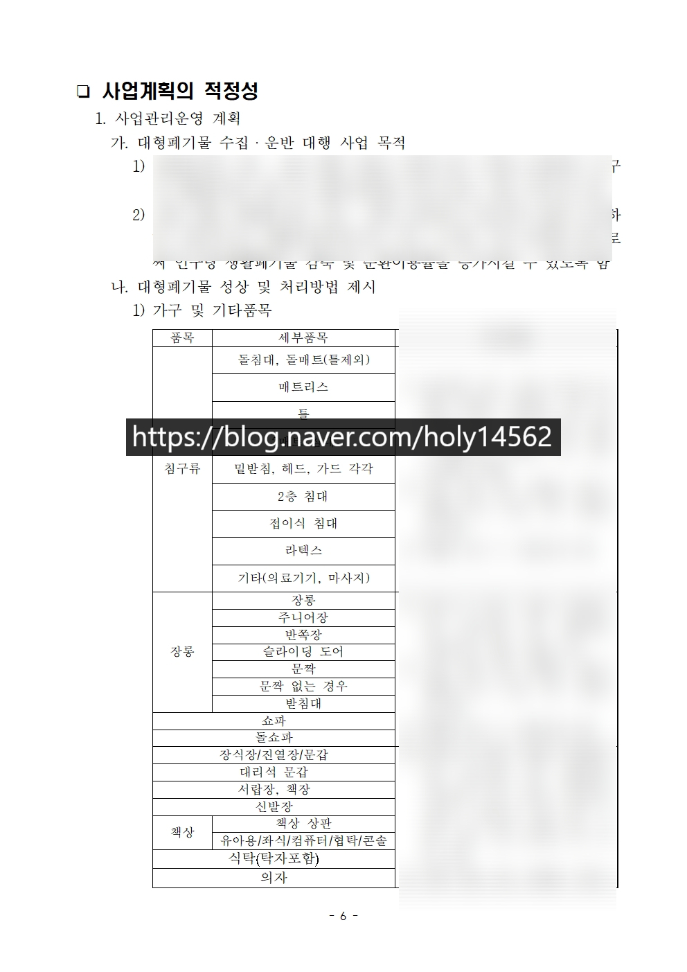 하지만 대형폐기물 수집운반업 사업계획서 작성방식은 전국지자체 모두 대동소이합니다.