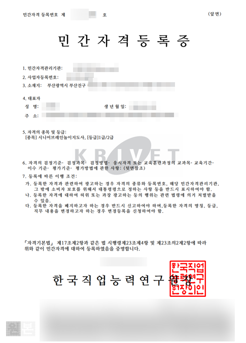 문화체육관광부 소관의 민간자격증인 시니어브레인미술지도사, 시니어브레인놀이지도사가 문제없이 등록완료 되었습니다.