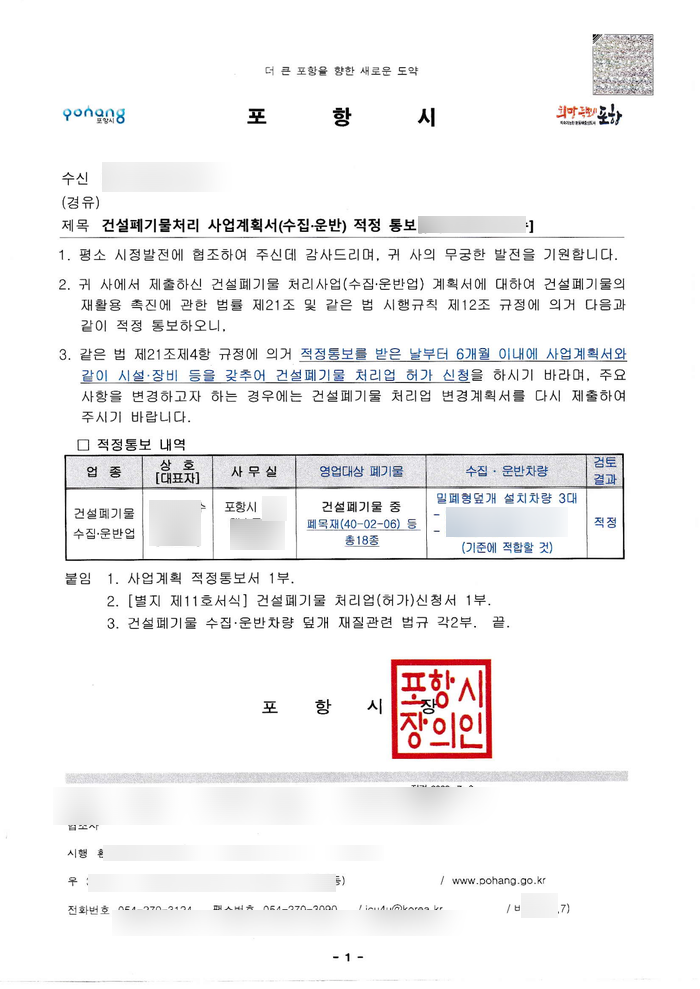 오늘은 포항에서 건설폐기물 수집운반업 허가 사업계획 적정통보를 받은 내용의 포스팅입니다.