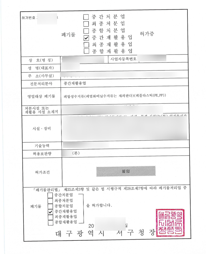 폐기물 중간재활용업 중 폐합성수지를 전문으로 처리하는 업체에서 의뢰를 주셔서, 변경허가 및 그에 따른 대기배출시설신고를 완료하였습니다.