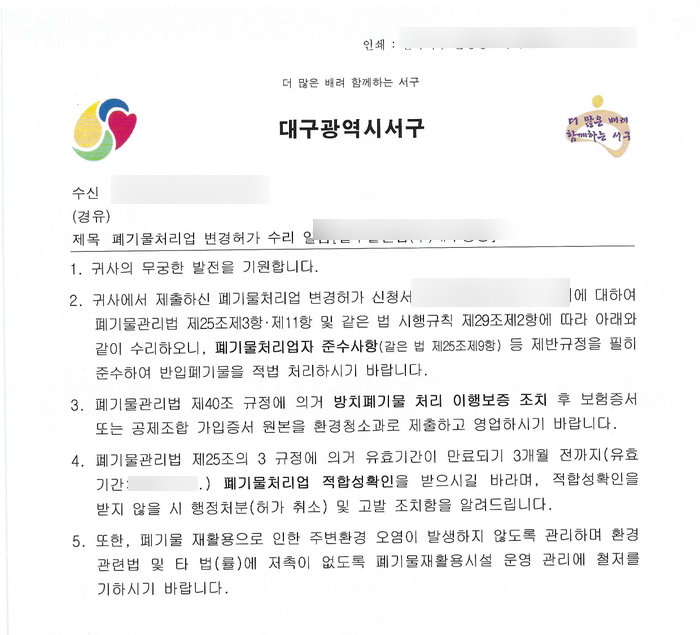 구청에서는 악취 문제와, 장소의 협소함, 정확한 파쇄기의 제원이 없다는 이유로 불허를 하였고, 이에 의뢰를 받아 폐기물중간재활용업 변경허가와 대기배출시설 신고를 완료하였습니다.