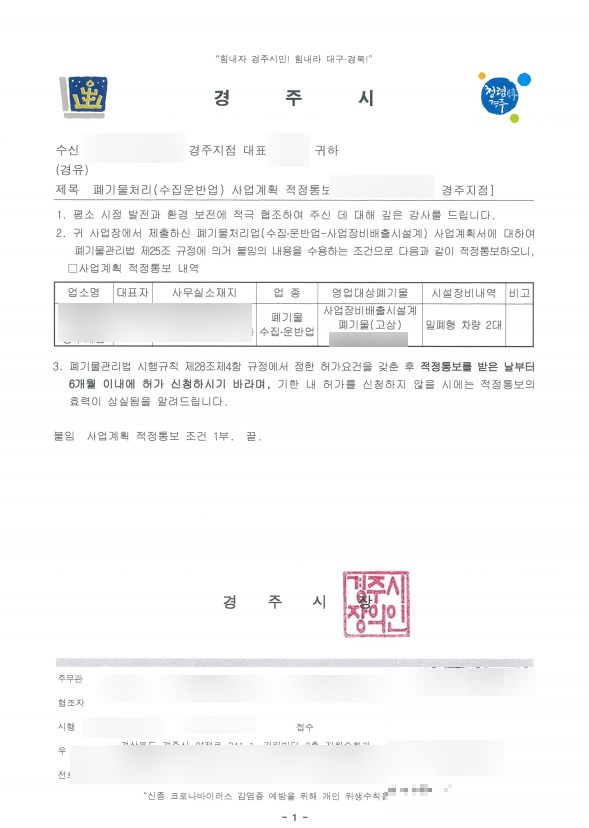 이번 폐기물 수집운반업 허가는 사업장비배출시설계 폐기물 수집, 운반 허가로, 경주에서 적합통보 사례입니다.
