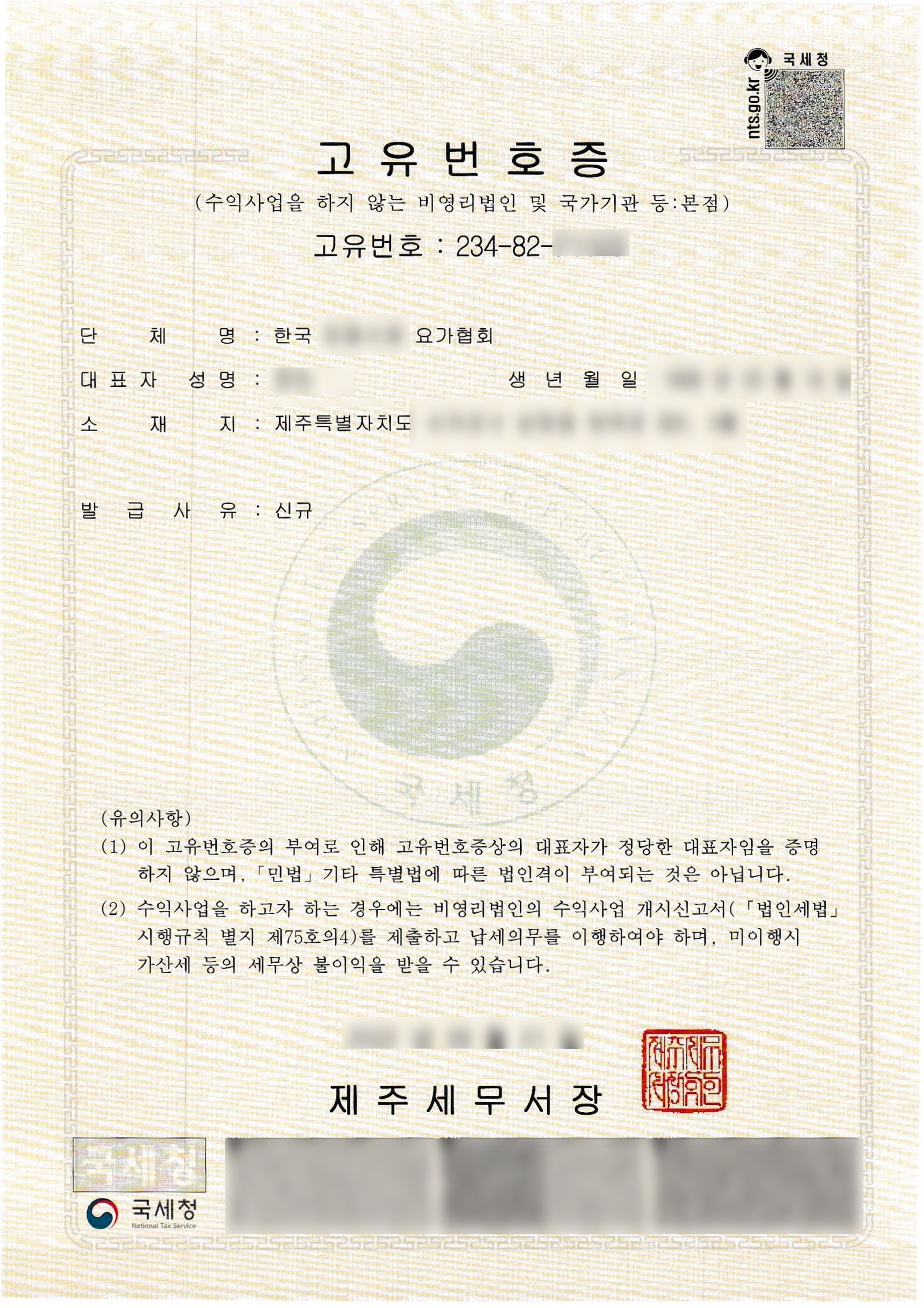 제주도에서 요가 민간자격증 등록을 의뢰하신 분이 협회이름으로 자격증을 만들고 싶어하셔서 먼저 협회이름으로 고유번호증을 발급해드린 사례입니다. 고유번호증은 아래에서 확인할 수 있습니다.