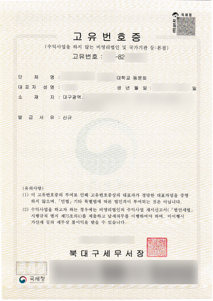 동문회, 동창회 고유번호증 발급은 보통 통장 개설을 위해 많이 진행 합니다.