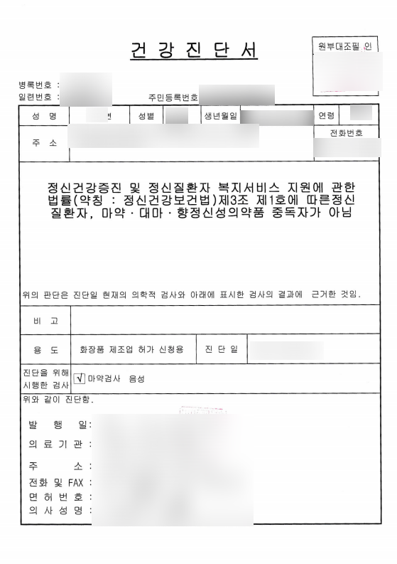 정신질환이나 마약류 중독에 관한 내용 포함되어야 하며, 문제가 있을 경우 업을 할 수 없습니다.