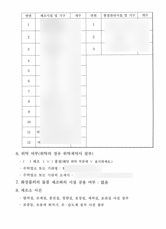 제조소 내에 있는 시설 내역을 전부 기재해야 합니다. 화장품 제조 장비, 구역, 포충등 등 방충 방서 내용이 포함됩니다.