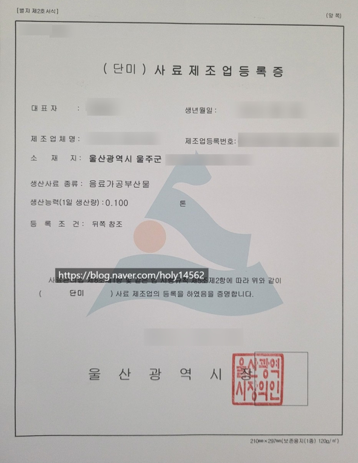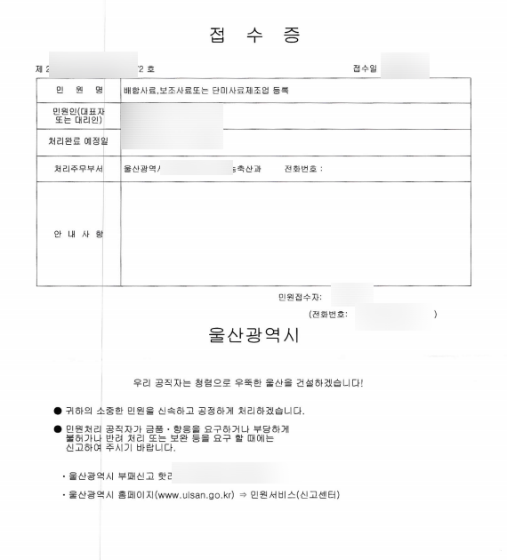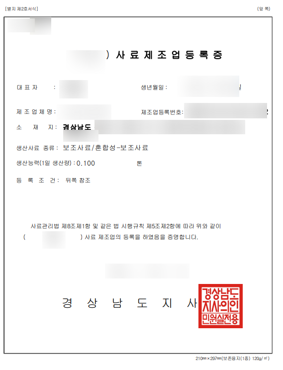 이 모든 과정이 다 준비되었으면 등록 신청을 합니다. 등록 신청 후 3주(15일)가 지나면 등록증이 발급됩니다. 근데, 바로 판매를 할 수 있는 것은 아니고, 등록 완료 후 판매하고자 하는 단미사료의 성분검사를 하고 해당 결과를 또 등록해야 합니다.