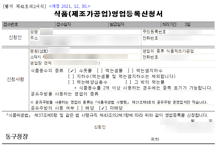 다만, 일반적으로 시설을 갖춰 놓고 실사를 먼저 한 다음 진행하기 때문에, 구청과 협의까지 포함하면 조금 더 시간이 소요 됩니다. 인테리어 기간 제외하고, 서류가 다 완비된 날로부터 3일로 보시면 됩니다. 그리고 식품제조 가공업 교육 이수, 보건증 발급 등도 있기 때문에, 사전에 준비를 해야 합니다.