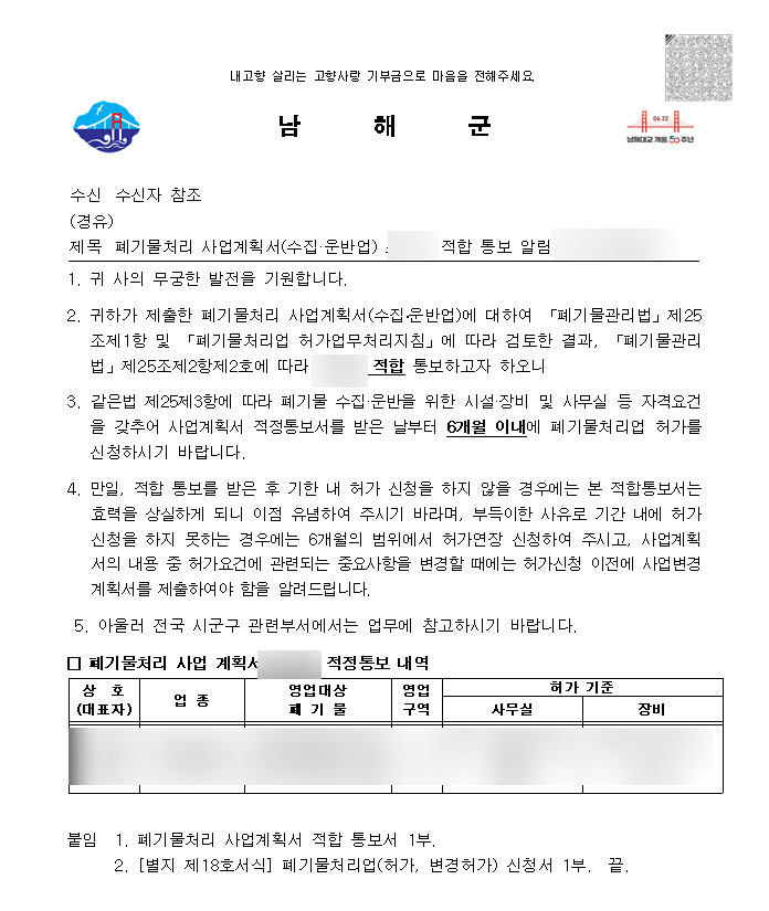 오늘 소개할 내용은 경상남도 남해군 폐기물수집운반업 사례입니다.