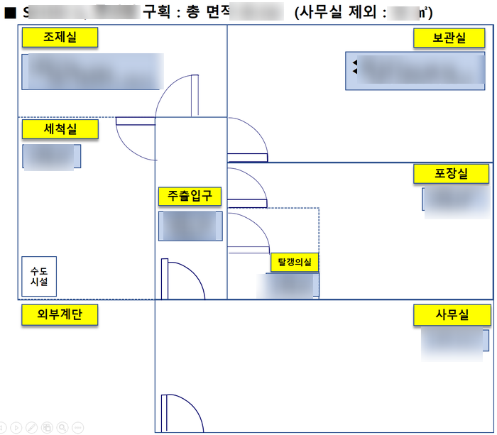 기존 작업했던 예시를 그대로 올려 드립니다. 다만, 이렇게 하더라도 조정은 필요하니, 참고하시면 되겠습니다. 보관실, 탈의실, 포장실, 충진실, 칭량실, 조제실, 세척실 등을 구비해야 합니다.
