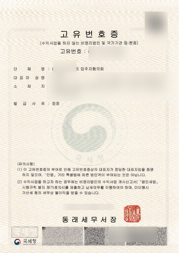 고유번호증을 발급 받는 이유는 고유번호증이 있어야 입주자협의회 명으로 은행 통장을 만들어 사용할 수 있기 때문입니다. 건설, 분진 등 환경 분쟁으로 인한 피해 금액 수령은 개인 통장으로 들어올 수 없고,