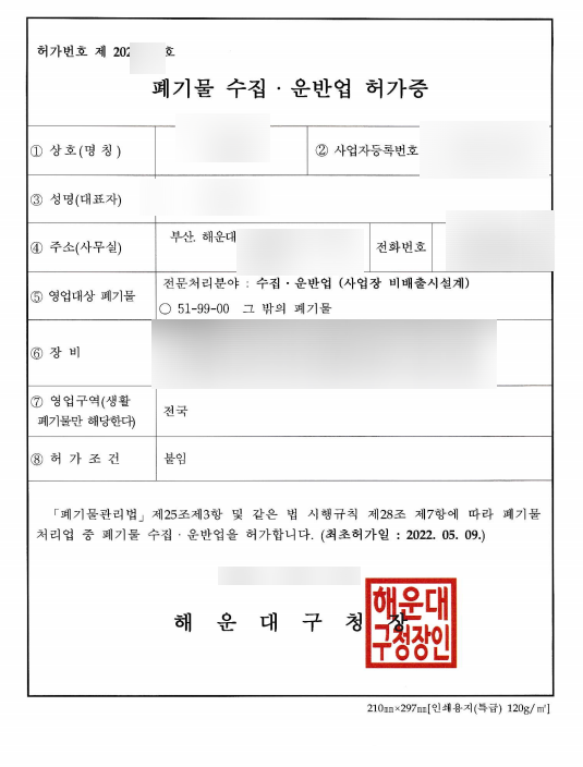 위 5종의 폐기물수집운반업 모두 허가 조건이 다르고 기간이 조금씩 다릅니다.