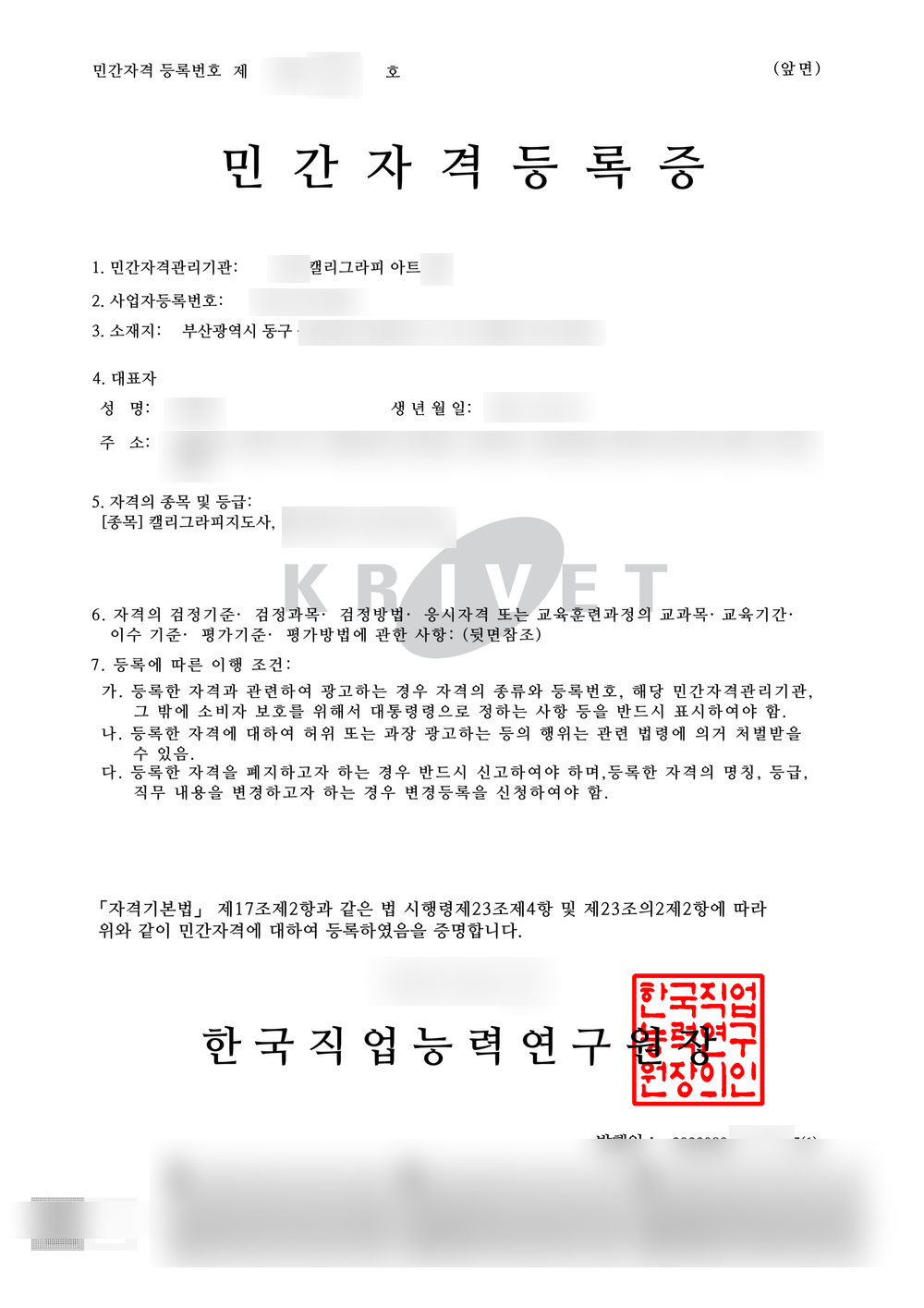 안녕하세요. 개인사업자로 화실은 운영하는 대표님의 의뢰를 받아 캘리그라피 민간자격증 등록을 완료한 사례입니다.