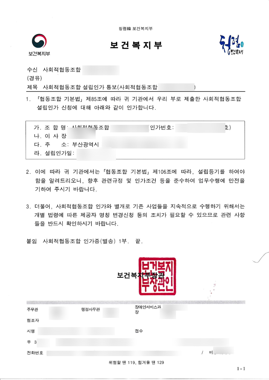 발달장애인 활동지원사업을 위한 사회적협동조합 설립 인가