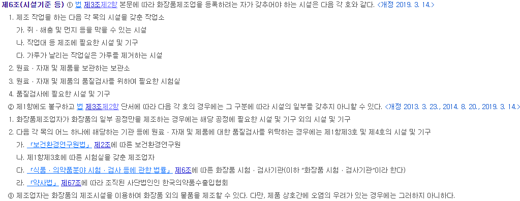 화장품제조업의 시설기준에 관해서는 화장품법 시행규칙에서 정하고 있고, 크게 4가지로 정리해볼 수 있습니다.