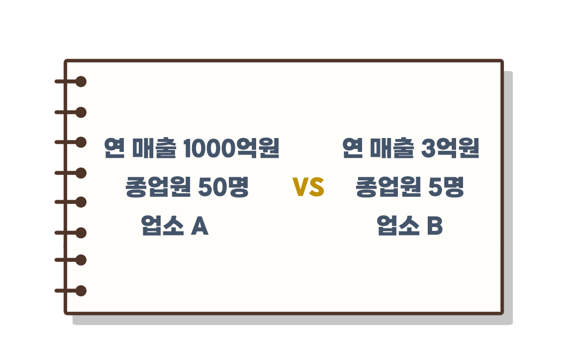 예를 들어 연매출 1000억원의 50명이 일하는 업소 A와 연매출 3억원의 5명이 일하는 업소 B가 있다고 가정해 봅시다.