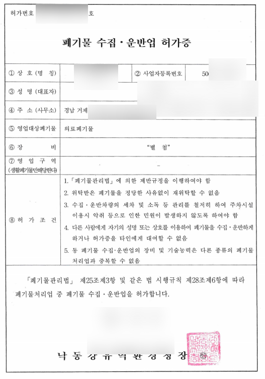 의료폐기물은 폐기물관리법에서 정하고 있는 지정폐기물에 해당합니다. 보통 일반적인 폐기물 수집운반업처럼 차량, 자본금, 사무실의 조건에 더하여 주차공간이 요구됩니다.