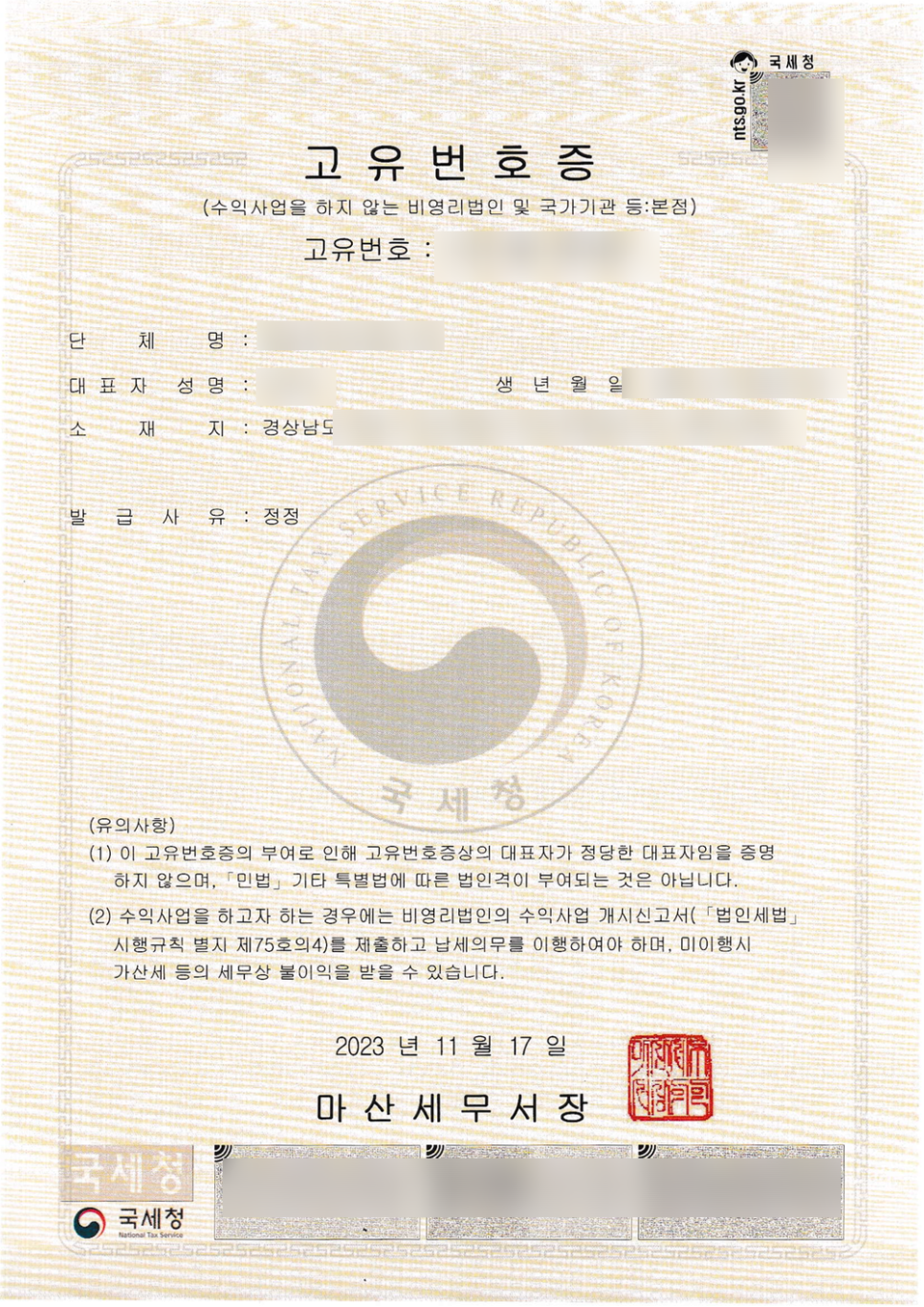 고유번호는 수익사업을 하지 않는 비영리단체에 대해 행정처리를 하기 위해 부여한 번호이며, 이것이 적힌 증서가 고유번호증입니다.