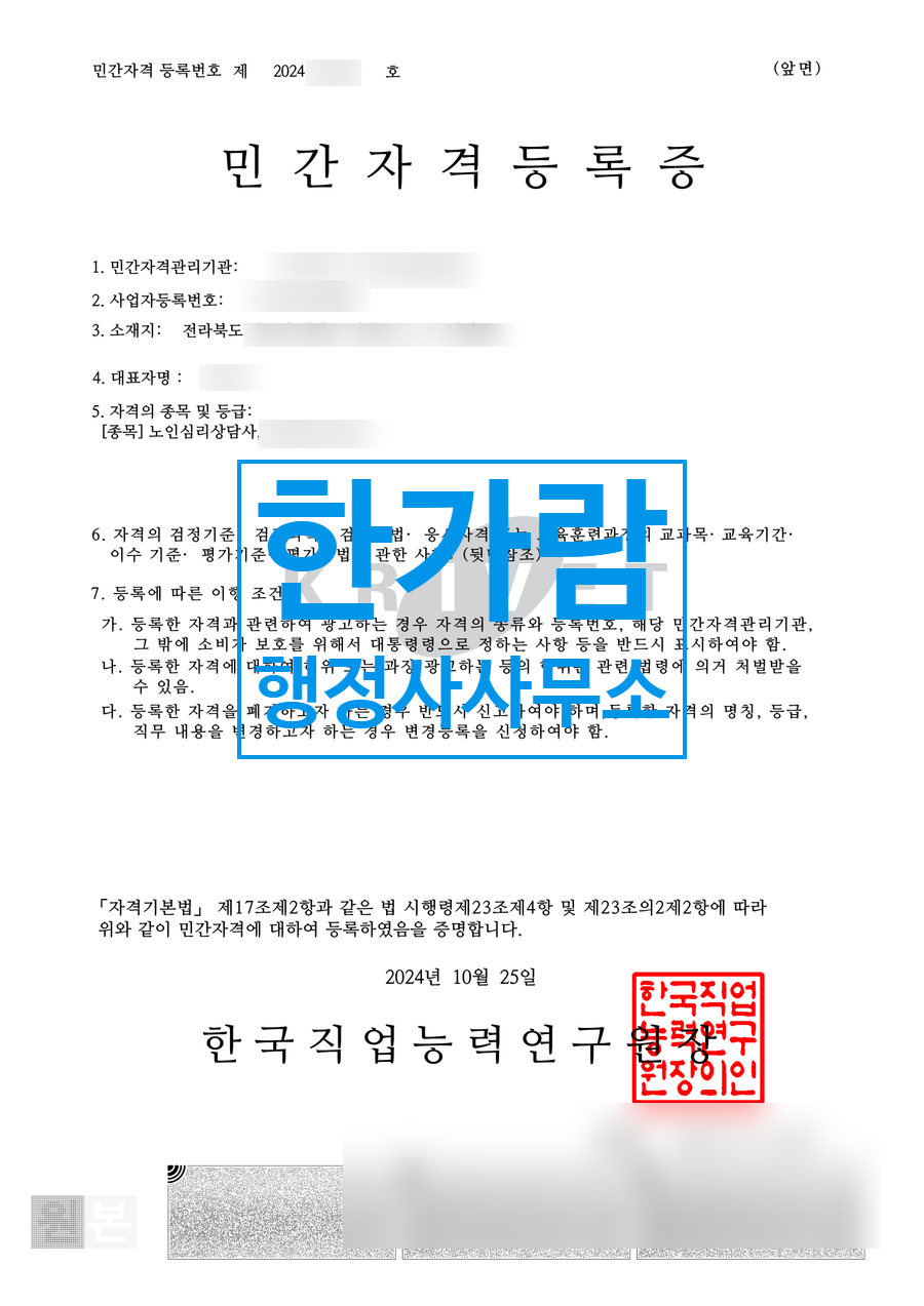 민간자격에 대한 직무내용, 검정기준, 과목 등의 운영 규정을 작성이 필요하며, 한가람행정사사무소에서 이 부분도 작성하여 신청해드립니다.