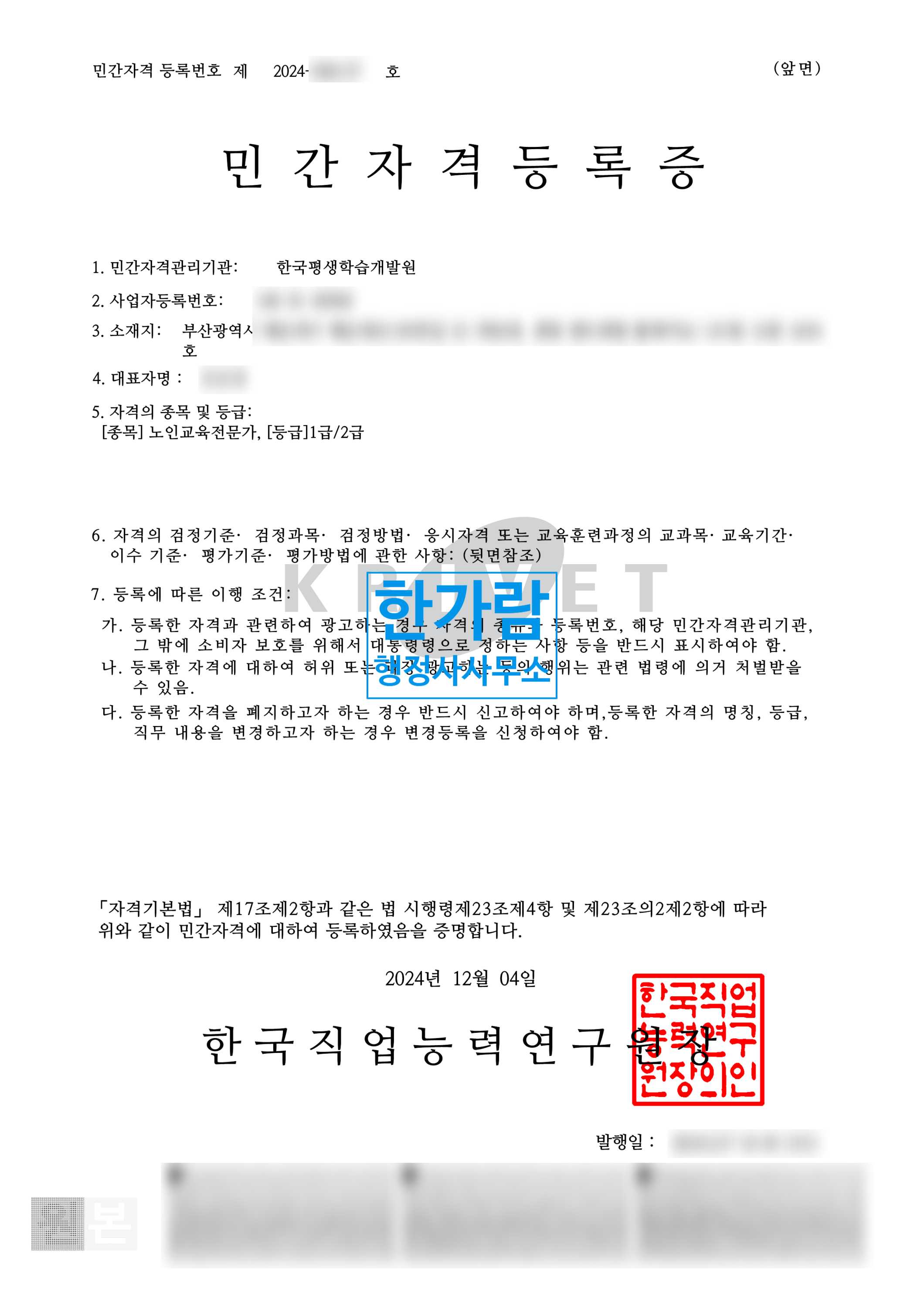 이번에 노인교육전문가, 노인돌봄생활지원사 민간자격증을 신청해주신게 잘 등록이 되어 사례를 공유합니다.