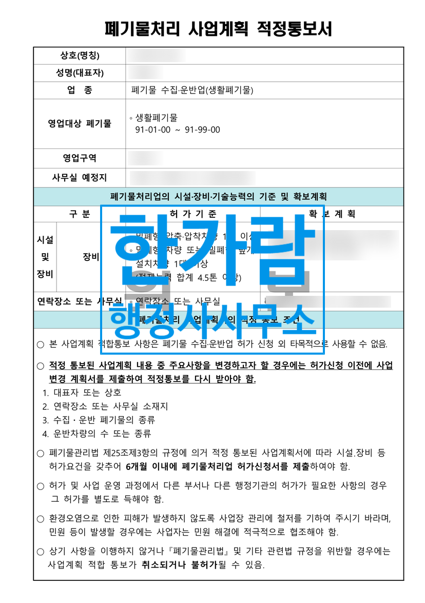1. 사업계획서작성 : 폐기물의 종류, 처리량, 수집·운반 계획 등의 내용을 포함