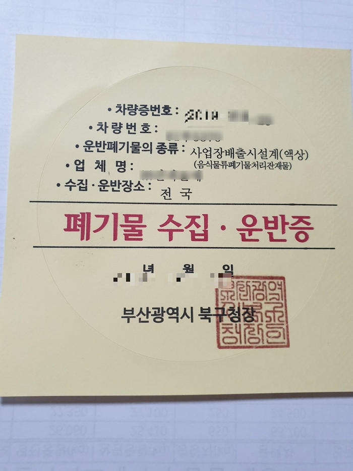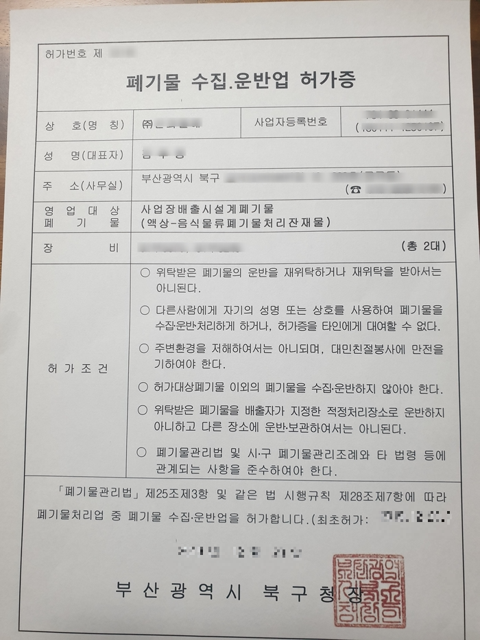 부산 북구 사업장 배출 시설계 폐기물 수집운반업 허가증 수령(음식물 폐기물)